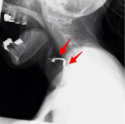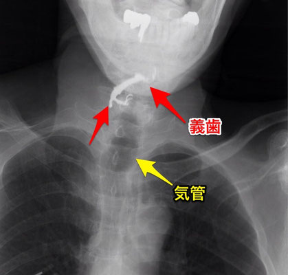 入れ歯の誤嚥は、このように場合によっては、摘出のため、手術ということにもなりかねません。また、咽頭や食道を傷つけると、そこから感染を生じ、縦隔膿瘍という、命にかかわる感染症を起こすこともあります。