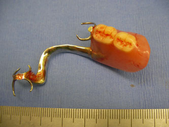 下のような、固定するための長い足を持った義歯は、縦向きに飲み込んでしまいがちです。爪の部分が、粘膜に食い込み、口からの摘出がかなり困難かつ、粘膜損傷の危険を伴います。