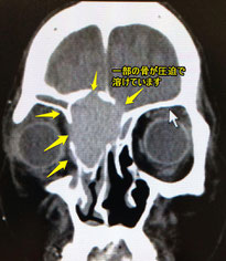 蓄膿症(副鼻腔炎)の手術を以前に受けた方にまれに見られますが、全く手術を受けたことがない方の例もあります。場合によっては眼を圧迫し、ものが二重に見えたりすることもあります。